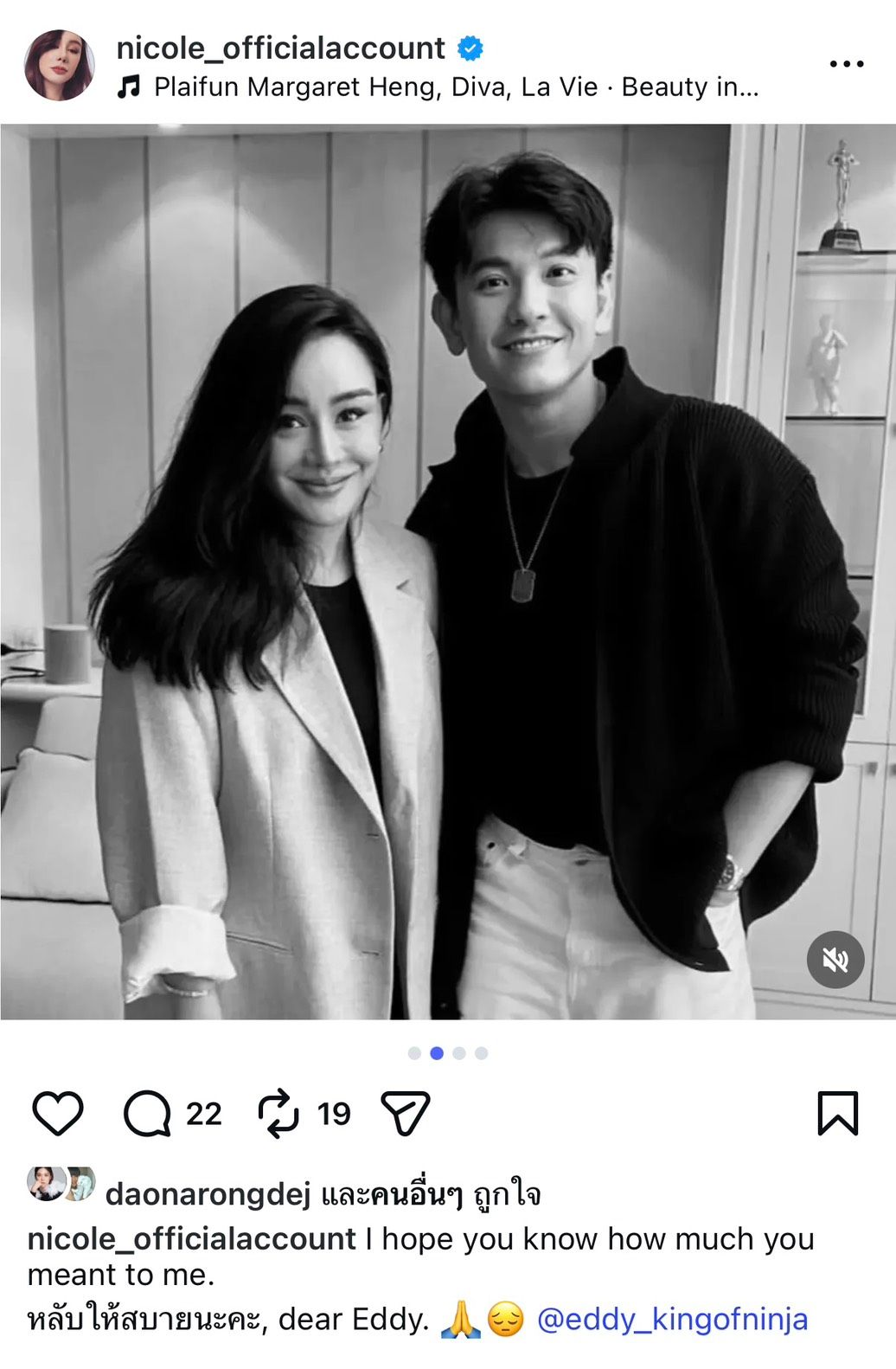 - นิโคล เทริโอ โพสต์อินสตาแกรมและแคปชันว่า "I hope you know how much you meant to me. หลับให้สบายนะคะ, dear Eddy."