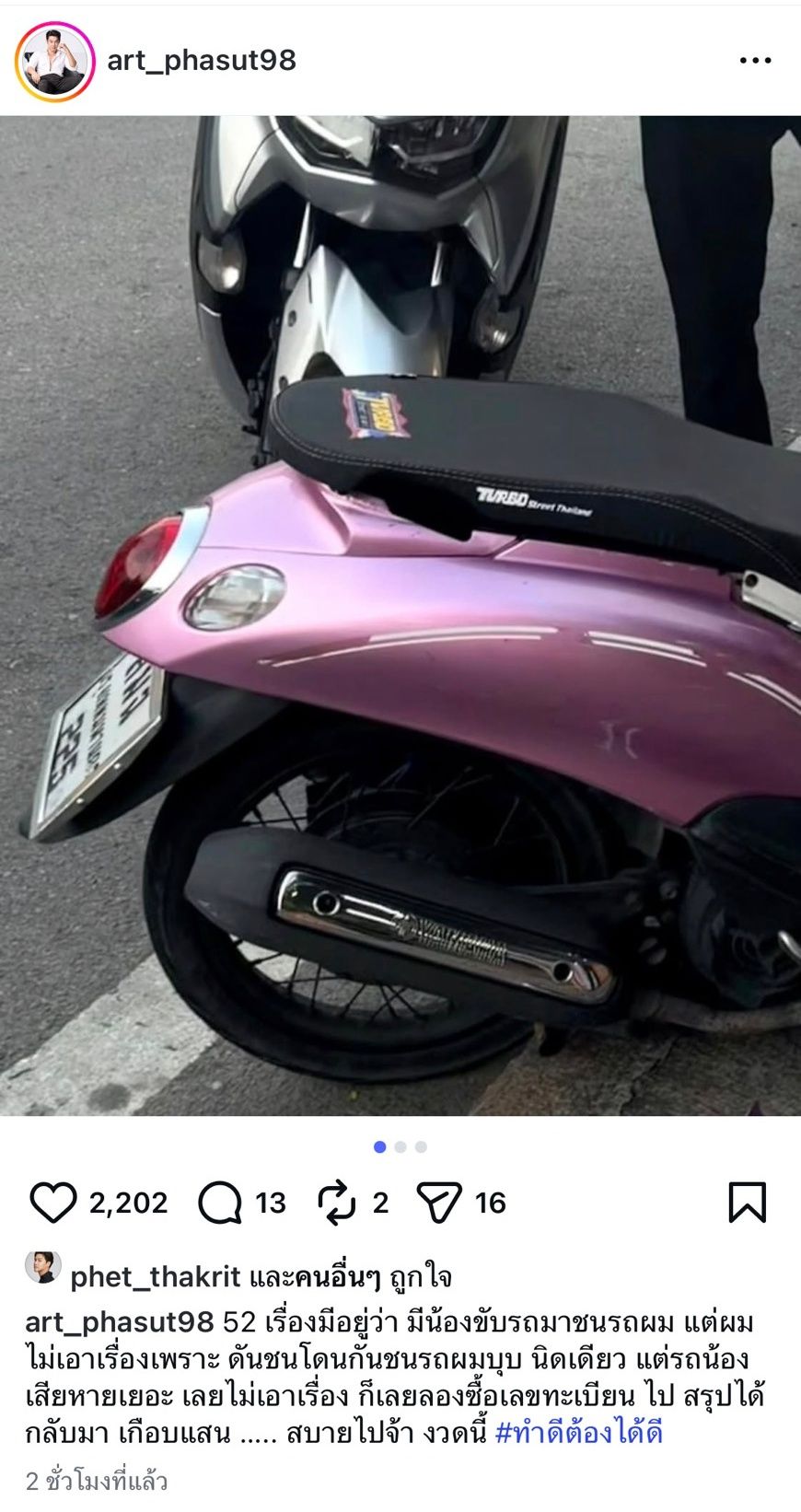รับทรัพย์ไปเต็มๆ เลยทีเดียว สำหรับนักแสดงหนุ่ม อาร์ต พศุตม์ บานแย้ม หลังจากที่ก่อนหน้านี้ได้เกิดอุบัติเหตุ ถูกรถมอเตอร์ไซค์พุ่งชนรถยนต์ที่ตัวเองขับ แต่ทางด้านมอเตอร์ไซค์เสียหายเยอะ ซึ่งตัวเองก็ไม่เอาเรื่องแต่อย่างใด เพราะรถของตนเองบุบนิดหน่อย แต่รถของน้องคู่กรณีนั้นเสียหายหนักมาก