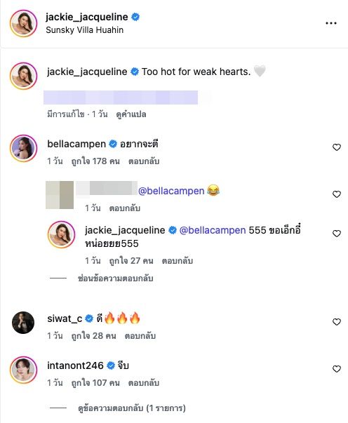 และอีกหนึ่งโพสต์ที่ทำเอาแฟนๆ ฮือฮา กับภาพแจ็คกี้ใส่เสื้อกล้ามสีขาว โพสท่ายกขาขึ้นเบาๆ อินเนอร์ความเซ็กซี่แบบเต็มร้อย ทำเอาแฟนๆ แห่คอมเมนต์อีโมจิไฟลุกและแซวรัวๆ อาทิ หื่อออ สวย ห่วงค่าา, เซ็กซี่, Sexy beatiful, ทำเกินอ่ะแม่, Sexy beautiful, สวยมากค่ะ, สลัดลุคที่เคยเห็นออกไปเลย, สวยละมุนมาก ฯลฯ