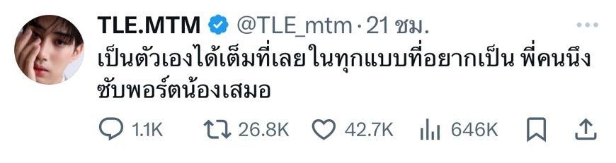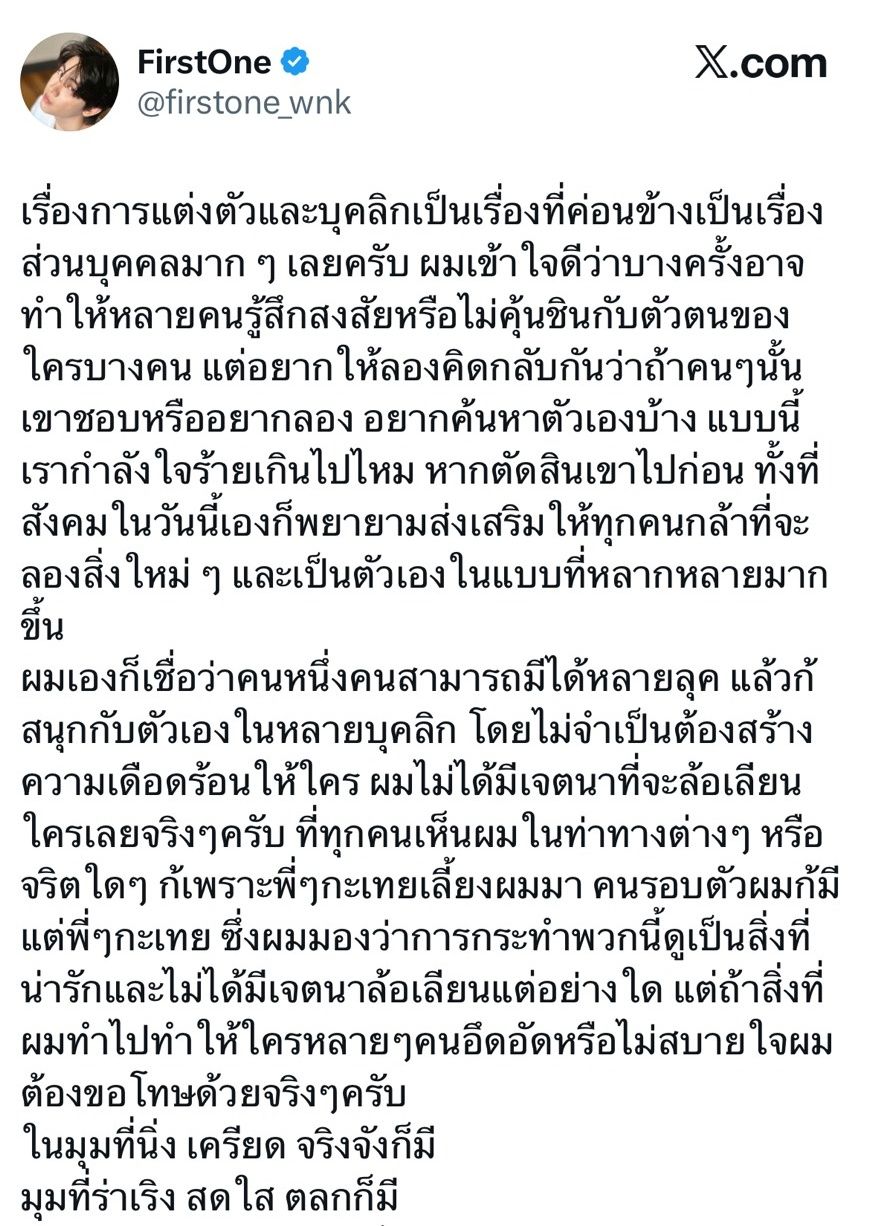 “เรื่องการแต่งตัวและบุคลิกเป็นเรื่องที่ค่อนข้างเป็นเรื่องส่วนบุคคลมากๆ เลยครับ ผมเข้าใจดีว่าบางครั้งอาจทำให้หลายคนรู้สึกสงสัยหรือไม่คุ้นชินกับตัวตนของใครบางคน แต่อยากให้ลองคิดกลับกันว่า ถ้าคนๆ นั้นเขาชอบหรืออยากลอง อยากค้นหาตัวเองบ้าง แบบนี้เรากำลังใจร้ายเกินไปไหม