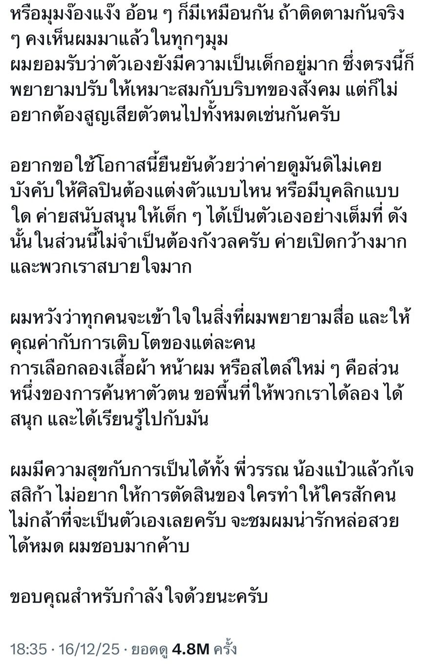 ผมหวังว่าทุกคนจะเข้าใจในสิ่งที่ผมพยายามสื่อ และให้คุณค่ากับการเติบโตของแต่ละคน การเลือกลองเสื้อผ้า หน้าผม หรือสไตล์ใหม่ๆ คือส่วนหนึ่งของการค้นหาตัวตน ขอพื้นที่ให้พวกเราได้ลอง ได้สนุก และได้เรียนรู้ไปกับมัน ผมมีความสุขกับการเป็นได้ทั้ง พี่วรรณ น้องแป๋วแล้วก็เจสสิก้า ไม่อยากให้การตัดสินของใครทำให้ใครสักคนไม่กล้าที่จะเป็นตัวเองเลยครับ จะชมผมน่ารักหล่อสวยได้หมด ผมชอบมากครับ ขอบคุณสำหรับกำลังใจด้วยนะครับ”