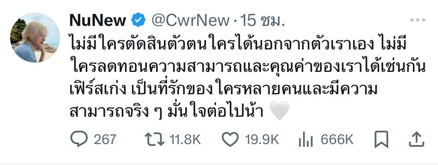 จากโพสต์ของ เฟิร์สวัน ด้าน นุนิว ชวรินทร์ ก็ได้เข้ามาคอมเมนต์ส่งกำลังใจ พร้อมบอกว่า “ไม่มีใครตัดสินตัวตนใครได้นอกจากตัวเราเอง ไม่มีใครลดทอนความสามารถและคุณค่าของเราได้เช่นกัน เฟิร์สเก่ง เป็นที่รักของใครหลายคนและมีความสามารถจริง ๆ มั่นใจต่อไปน้า”