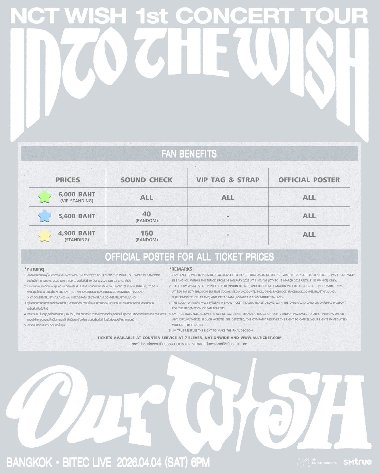 การกลับมาครั้งนี้คือการยกระดับสู่คอนเสิร์ตเต็มรูปแบบที่จะเผยสีสันอันเป็นเอกลักษณ์เฉพาะตัวของพวกเขาอย่างชัดเจน ผ่านดนตรีและเวทีที่ถ่ายทอด “ความปรารถนาและความฝัน” พร้อมบอกเล่าเรื่องราวการเติบโตเพื่อก้าวไปสู่เป้าหมายที่สูงขึ้นร่วมกับ NCTzen WISH (เอ็นซีทีเซ็น วิช : ชื่อแฟนคลับอย่างเป็นทางการ) เมื่อ NCT WISH (เอ็นซีที วิช) และ NCTzen WISH (เอ็นซีทีเซ็น วิช) ถูกเชื่อมโยงไว้ด้วย “WISH เดียวกัน” ความปรารถนาที่จะได้อยู่ด้วยกันจะถูกเติมเต็มและกลายเป็นความจริงใน NCT WISH 1st CONCERT TOUR 'INTO THE WISH : Our WISH' IN BANGKOK (เอ็นซีที วิช เฟิสต์ คอนเสิร์ต ทัวร์ ‘อินทู เดอะ วิช : อาวเออร์ วิช’ อิน แบงค็อก) เปิดจำหน่ายบัตรรอบสมาชิก “NCTzen WISH” Membership (GL) Pre-Sale ในวันศุกร์ที่ 16 มกราคม 2026 เวลา 11:00 น. – 20:59 น. เท่านั้น และรอบบุคคลทั่วไป (General Sale) ในวันอาทิตย์ที่ 18 มกราคม 2026 ตั้งแต่เวลา 11:00 น. เป็นต้นไป ทางเคาน์เตอร์เซอร์วิสในร้าน 7-Eleven ทุกสาขาทั่วประเทศ และทางเว็บไซต์ www.allticket.com/event/NCTWISH_OurWISH_BANGKOK บัตรราคา 6,000 (VIP PACKAGE บัตรยืน) / 5,600 / 4,900 (บัตรยืน) / 4,500 / 3,500 / 2,500 บาท ติดตามข่าวสารและรายละเอียดเพิ่มเติมของคอนเสิร์ตได้ทางบัญชีโซเชียลมีเดียต่าง ๆ