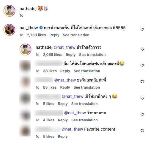 งานนี้นัททิวก็เข้ามาคอมเมนต์ว่า “การทำคอนเท้น ที่ไม่ใช่ออกกำลังกายของพี่ 5555” ก่อนที่เจฟจะตอบกลับว่า “น่ารักแล้ววววว” ทำเอาเพื่อนๆ แฟนๆ แห่แซวเพียบ อาทิ อืม ให้มันโสดแต่แฟนคลับนะคะพี่, ขอวันละคลิปค่ะพี่, เสิร์ฟมาอีกค่ะ ๆ, ว้ายยยยยย, โอ้ย น่ารักมาก!!!, ในที่สุดดด ฯลฯ