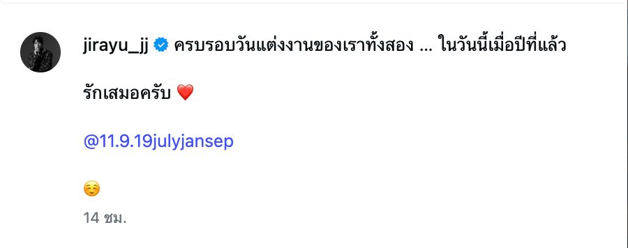 และล่าสุด ว่าที่คุณพ่อก็ได้โพสต์รูปในวันแต่งงาน (19 ธ.ค.67) เพื่อฉลองวันครบรอบแต่งงาน 1 ปีของทั้งคู่ พร้อมเขียนแคปชันเอาไว้ว่า "ครบรอบวันแต่งงานของเราทั้งสอง … ในวันนี้เมื่อปีที่แล้ว รักเสมอครับ" ทำเอาเพื่อนๆ และแฟนๆ เข้ามาคอมเมนต์แสดงความยินดีพร้อมกับอวยพรให้กับทั้งคู่อีกครั้งอย่างมากมาย