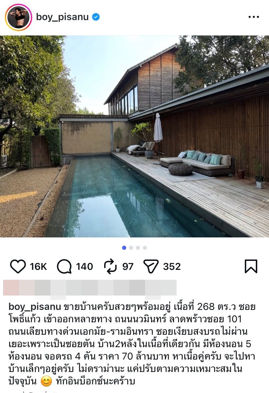 และล่าสุด บอย ภิษณุ ก็ได้ตัดสินใจออกมาประกาศขายบ้านสุดหรูของตัวเองในราคา 70 ล้าน พร้อมกับเผยเหตุผลที่ตัดสินใจขาย ก็เพราะว่าจะไปหาบ้านหลังเล็กๆ อยู่ตามความเหมาะสมในปัจจุบันของตัวเอง
