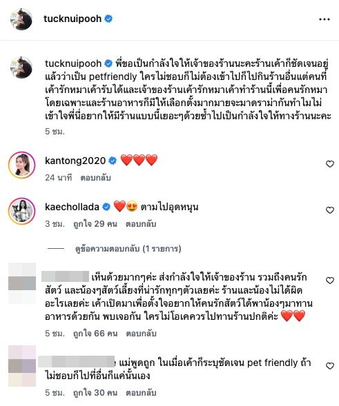 ล่าสุดนักแสดงตลก-นักร้องสาว ตั๊ก ศิริพร อยู่ยอด ซึ่งเป็นอีกหนึ่งคนที่รักสุนัข ก็ได้โพสต์แสดงความคิดเห็นผ่านทางอินสตาแกรม @tucknuipooh ถึงเรื่องนี้ไว้ว่า “พี่ขอเป็นกำลังใจให้เจ้าของร้านนะคะ ร้านเค้าก็ชัดเจนอยู่แล้วว่าเป็น pet friendly ใครไม่ชอบก็ไม่ต้องเข้าไปก็ไปกินร้านอื่น