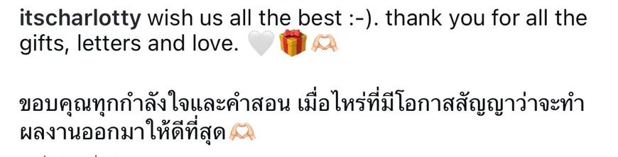 “Wish us all the best :-). Thank you for all the gifts, letters and love. ขอบคุณทุกกำลังใจและคำสอน เมื่อไหร่ที่มีโอกาสสัญญาว่าจะทำผลงานออกมาให้ดีที่สุด”