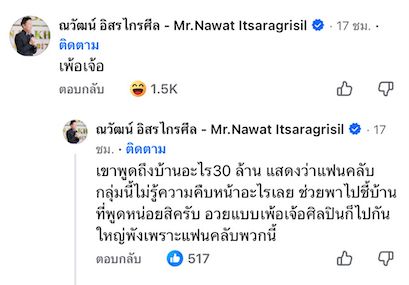 หลังจากที่คลิปดังกล่าวถูกเผยแพร่ ณวัฒน์ อิสรไกรศีล ก็ได้เข้ามาคอมเมนต์สั้นๆ ใต้โพสต์คลิปนี้ว่า "เพ้อเจ้อ" ก่อนจะคอมเมนต์ต่อว่า "เขาพูดถึงบ้านอะไร 30 ล้าน แสดงว่าแฟนคลับกลุ่มนี้ไม่รู้ความคืบหน้าอะไรเลย ช่วยพาไปชี้บ้านที่พูดหน่อยสิครับ อวยแบบเพ้อเจ้อศิลปินก็ไปกันใหญ่พังเพราะแฟนคลับพวกนี้"