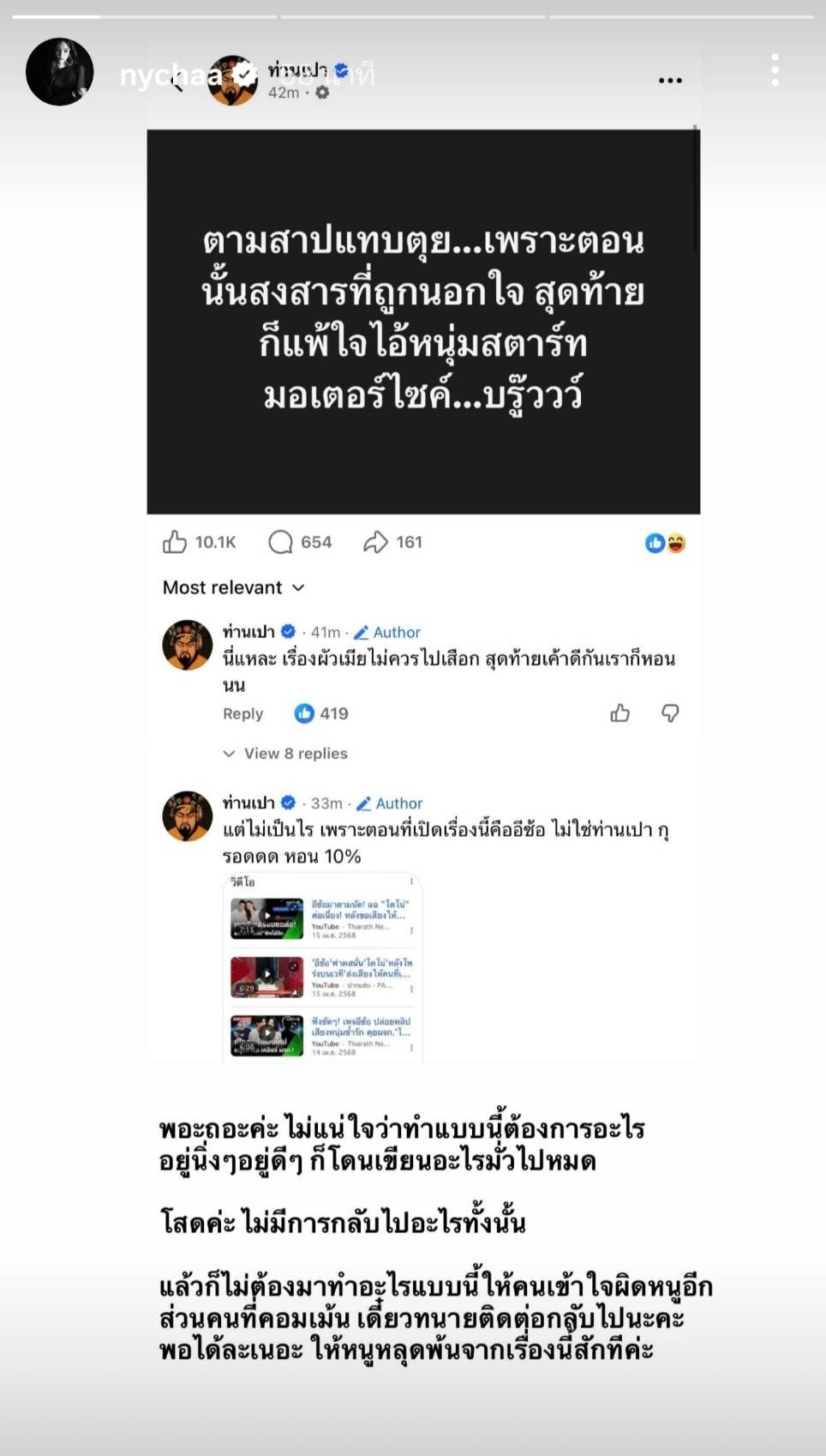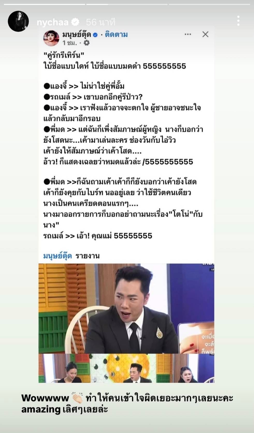จากนั้นก็โพสต์อีกว่า "Wowwww ทำให้คนเข้าใจผิดเยอะมากๆ เลยนะคะ amazing เลิศๆ เลยล่ะ" รวมถึงข้อความ "ขอพิมพ์ชี้แจงไว้ตรงนี้นะคะ เนื่องจากมีคนเข้าใจผิดว่า ข่าวคู่รักรีเทิร์นเป็นหนูเยอะมากๆ ก่อนอื่นหนูขอถามเลยว่าไม่มีอะไรจะเขียนจะลงกันแล้วหรอคะ ถึงทําให้คนเข้าใจผิดคนๆ นึงได้ขนาดนี้ หนูทําอะไรผิดเหรอคะ ถึงต้องมาโดนอะไรแบบนี้ คอยโดนลากกลับไปในเรื่องนี้