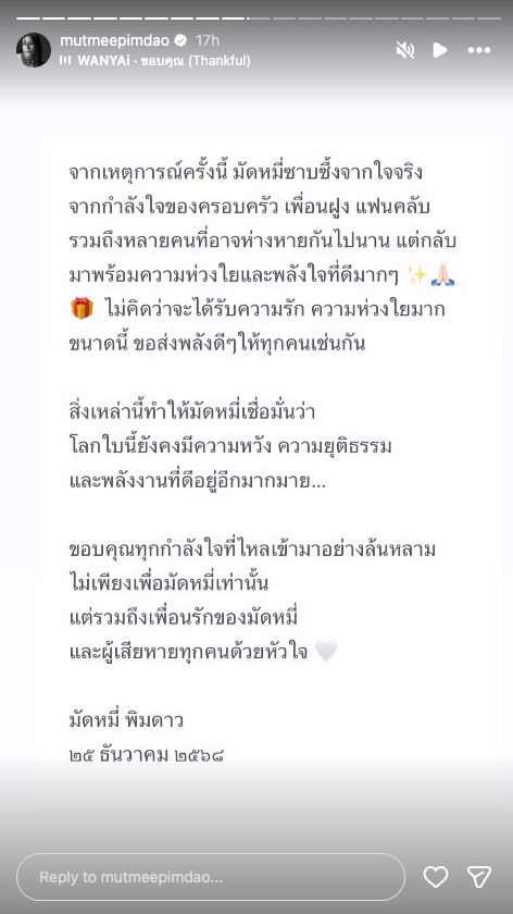 ซึ่งทำเอาหลายคนตกใจไม่น้อยเมื่อได้รับฟังเรื่องราวของนักแสดงสาว ซึ่งงานนี้ก็มีคนเข้าไปคอมเมนต์ให้กำลังใจ หรือคนที่เจอเหตุการณ์เดียวกันก็เข้ามาแสดงความคิดเห็นในเรื่องนี้อย่างมากมาย ล่าสุด มัดหมี่ได้โพสต์ข้อความจากใจของตัวเองลงในไอจีสตอรี่ซึ่งมีข้อความระบุว่า