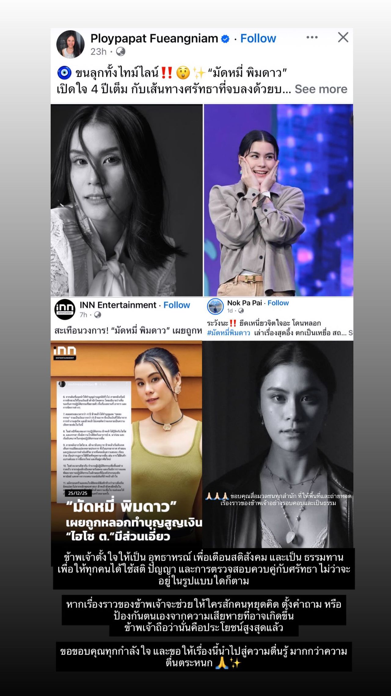 นอกจากนี้ มัดหมี่ยังได้เขียนข้อความต่ออีกว่า “ข้าพเจ้าตั้งใจให้เป็นอุทธาหรณ์เพื่อเตือนสติสังคม และเป็นธรรมทาน เพื่อให้ทุกคนได้ใช้สติ ปัญญา และการตรวจสอบควบคู่กับศรัทธา ไม่ว่าจะอยู่ในรูปแบบใดก็ตาม หากเรื่องของข้าพเจ้าจะช่วยให้ใครสักคนหยุดคิด ตั้งคำถาม หรือ ป้องกันตนเองจากความเสียหายที่อาจเกิดขึ้น ข้าพเจ้าถือว่านั่นคือประโยชน์สูงสุดแล้ว ขอขอบคุณทุกกำลังใจ และขอให้เรื่องนี้นำไปสู่ความตื่นรู้มากกว่าความตื่นตระหนก”