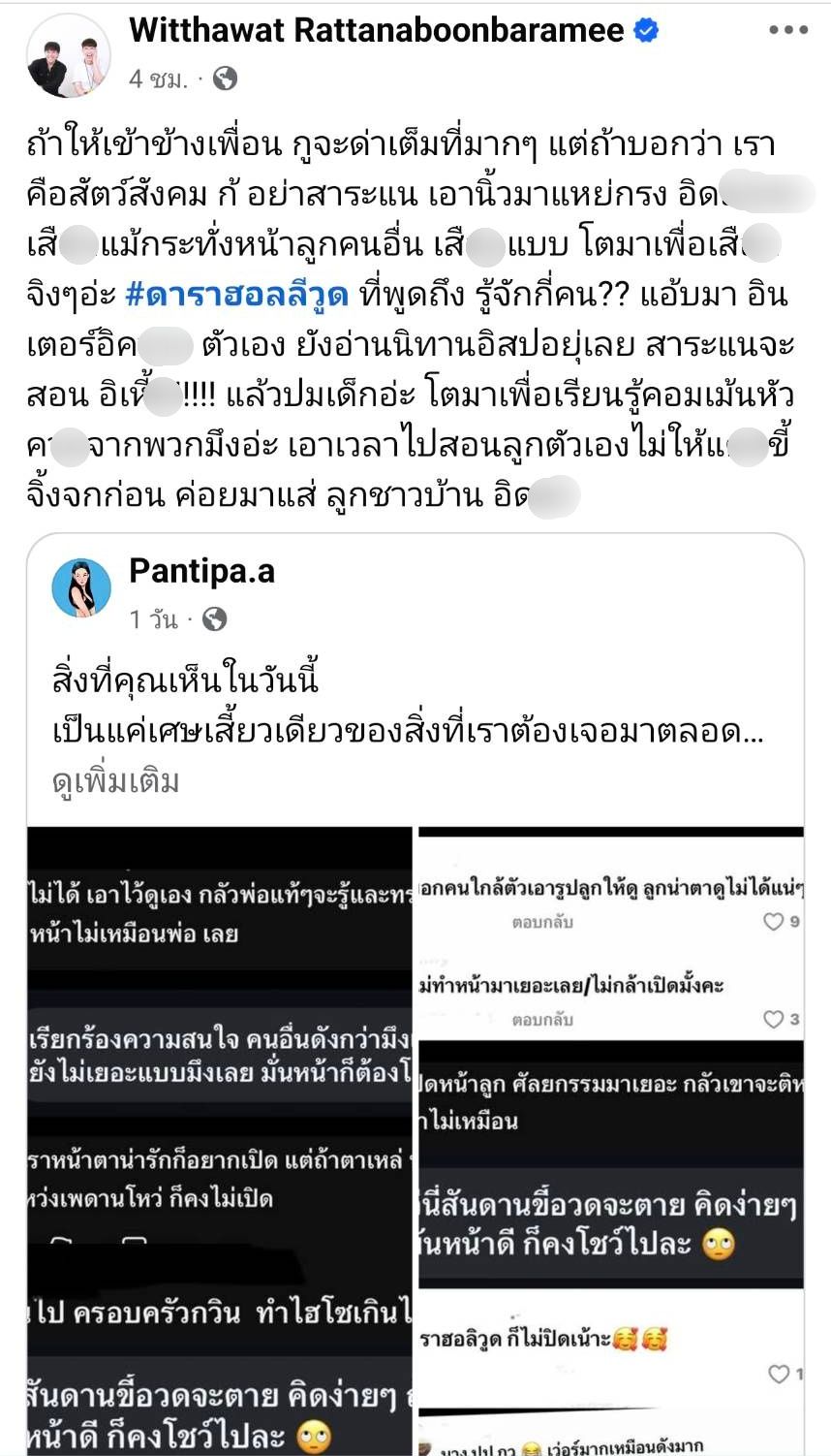 ซึ่งหลังจากที่ปุ้มปุ้ยโพสต์ไป ล่าสุดพิธีกร-ยูทูบเบอร์ดัง เอม วิทวัส รัตนบุญบารมี ก็แชร์โพสต์ของปุ้มปุ้ย พร้อมทั้งเขียนข้อความเดือดฟาดกลับแทนเพื่อนไว้ว่า “ถ้าให้เข้าข้างเพื่อน กูจะด่าเต็มที่มากๆ แต่ถ้าบอกว่า เราคือสัตว์สังคม ก็อย่าสาระแน เอานิ้วมาแหย่กรง อิดxxxx เxือกแม้กระทั่งหน้าลูกคนอื่น เxือกแบบ โตมาเพื่อเxือกจิงๆ อ่ะ