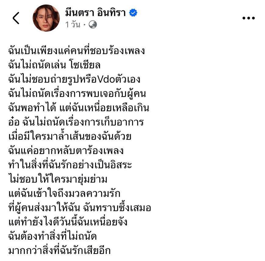 ทำเอาแฟนๆ ต่างเป็นห่วง หลังได้เห็นโพสต์นักร้องสาว มีนตรา อินทิรา แม้ที่ผ่านมาเจ้าตัวจะก้าวข้ามผ่านดราม่ามาได้ ทั้งเรื่องการแต่งตัว เรื่องรูปร่าง แต่สุดท้ายแล้วเหมือนความรู้สึกทุกอย่างทั้งหมดที่ผ่านมาจะปะทุออกมาหมด ทั้งในเรื่องความรู้สึก และความเหนื่อยล้าในการใช้ชีวิต