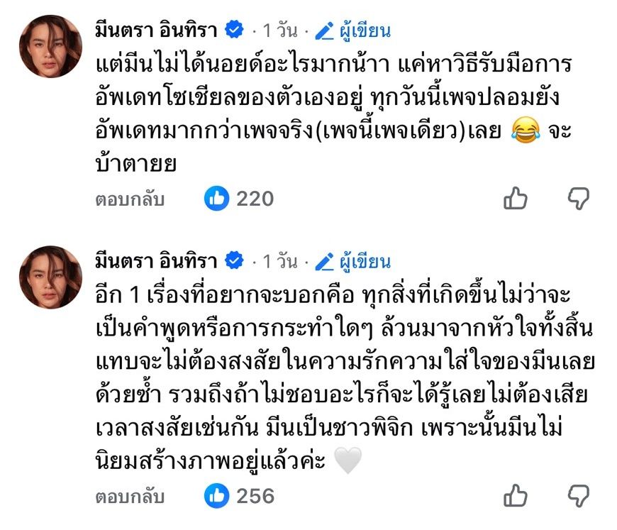 และได้เขียนเพิ่มเติมในคอมเมนต์ว่า “แต่มีนไม่ได้นอยด์อะไรมากน้าา แค่หาวิธีรับมือการอัพเดทโซเชียลของตัวเองอยู่ ทุกวันนี้เพจปลอมยังอัพเดทมากกว่าเพจจริง(เพจนี้เพจเดียว)เลย จะบ้าตายย” และ “อีก 1 เรื่องที่อยากจะบอกคือ ทุกสิ่งที่เกิดขึ้นไม่ว่าจะเป็นคำพูดหรือการกระทำใดๆ ล้วนมาจากหัวใจทั้งสิ้น แทบจะไม่ต้องสงสัยในความรักความใส่ใจของมีนเลยด้วยซ้ำ รวมถึงถ้าไม่ชอบอะไรก็จะได้รู้เลยไม่ต้องเสียเวลาสงสัยเช่นกัน มีนเป็นชาวพิจิก เพราะฉะนั้นมีนไม่นิยมสร้างภาพอยู่แล้วค่ะ”