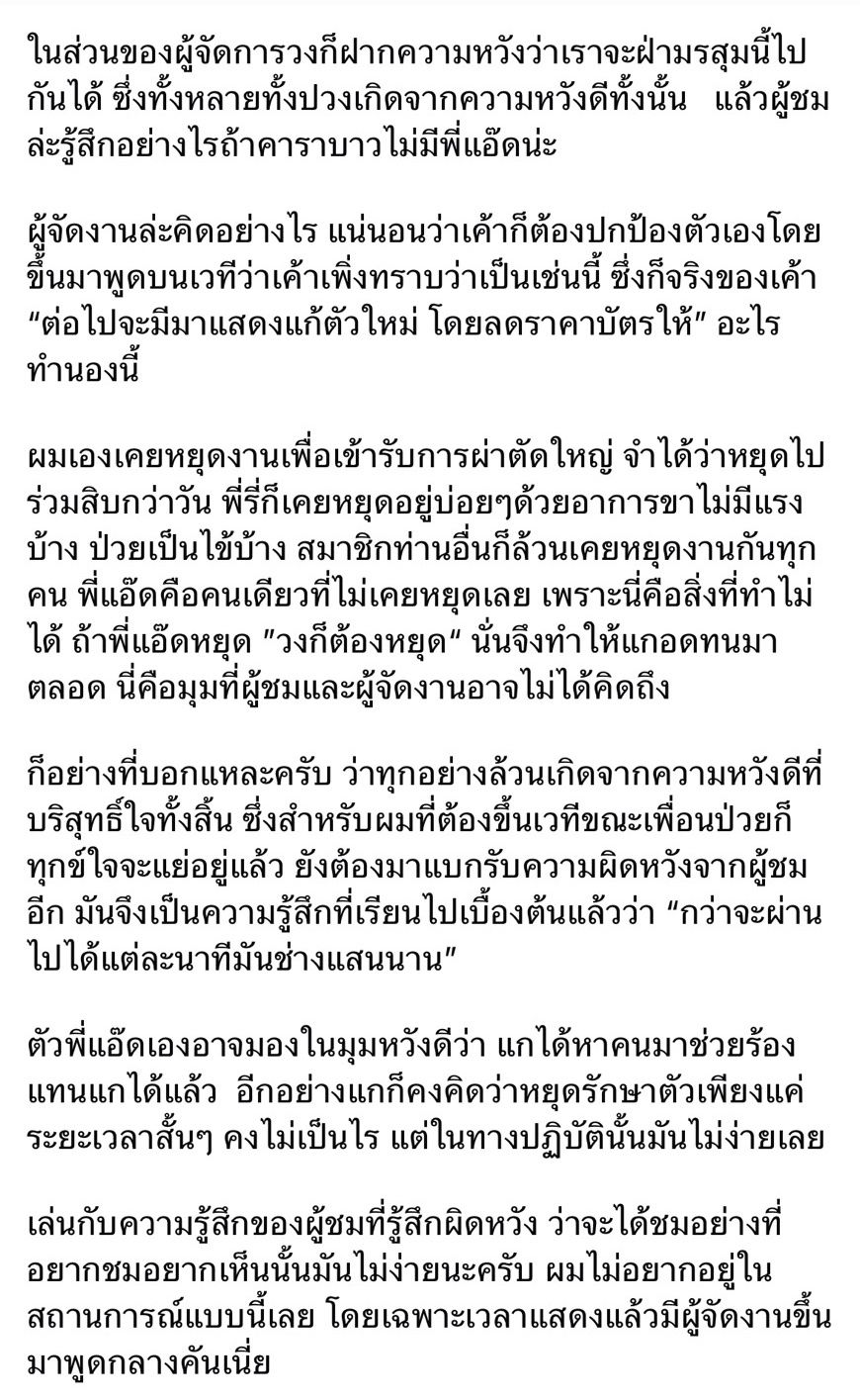 ก็อย่างที่บอกแหละครับ ว่าทุกอย่างล้วนเกิดจากความหวังดีที่บริสุทธิ์ใจทั้งสิ้น ซึ่งสำหรับผมที่ต้องขึ้นเวทีขณะเพื่อนป่วยก็ทุกข์ใจจะแย่อยู่แล้ว ยังต้องมาแบกรับความผิดหวังจากผู้ชมอีก มันจึงเป็นความรู้สึกที่เรียนไปเบื้องต้นแล้วว่า “กว่าจะผ่านไปได้แต่ละนาทีมันช่างแสนนาน”