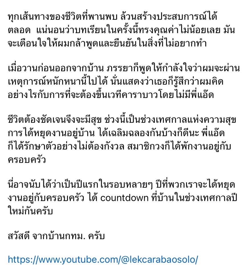 ชีวิตต้องชัดเจนจึงจะมีสุข ช่วงนี้เป็นช่วงเทศกาลแห่งความสุข การได้หยุดงานอยู่บ้าน ได้เฉลิมฉลองกันบ้างก็ดีนะ พี่แอ๊ดก็ได้รักษาตัวอย่างไม่ต้องกังวล สมาชิกวงก็ได้พักงานอยู่กับครอบครัว