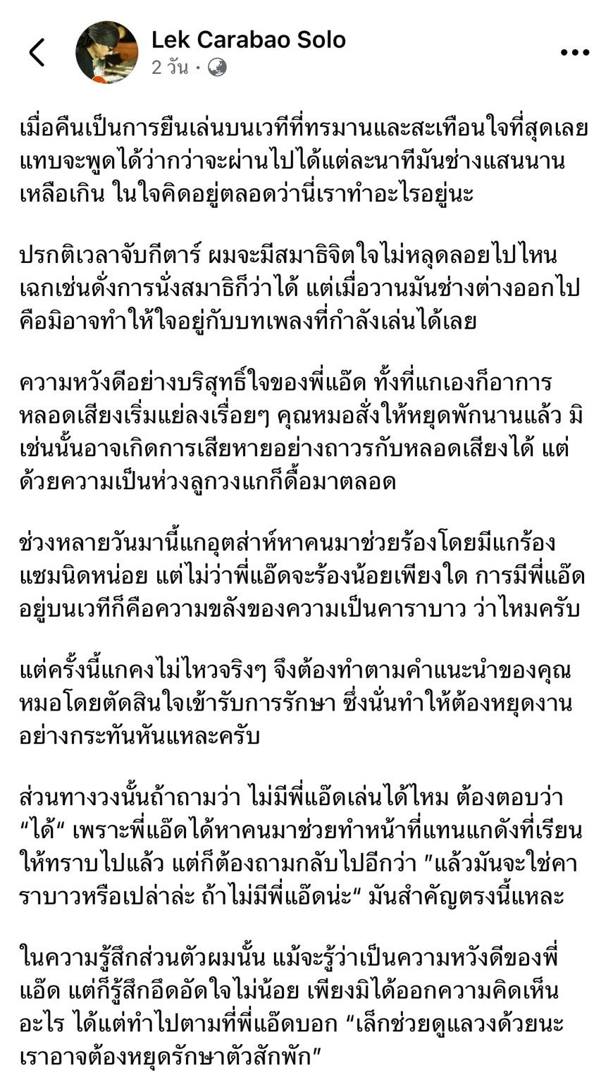 ทำเอาแฟนๆ พากันเป็นห่วงอย่างมาก หลังได้เห็นโพสต์ของ เล็ก คาราบาว ที่ได้ออกมาเปิดเผยอาการป่วยของ แอ๊ด คาราบาว ที่รู้สึกสะเทือนใจเป็นที่สุด รู้สึกทรมานอย่างมาก หลังไม่มี แอ๊ด คาราบาว อยู่บนเวทีด้วยกัน เนื่องจากอาการป่วยทางหลอดเสียงที่เริ่มแย่ลง จนหมอต้องสั่งให้พัก มิเช่นนั้นจะเกิดความเสียหายได้ ยอมรับรู้สึกกดดัน เพราะทางแฟนเพลงก็อยากให้ แอ๊ด คาราบาว อยู่บนเวที