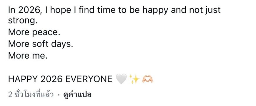 ในปี 2026 นี้ ฉันหวังว่าตัวเองจะมีเวลาให้กับ “ความสุข” มากพอๆ กับการ “เข้มแข็ง” ขอให้พบความสงบในใจมากขึ้น ขอให้เป็นวันเวลาที่อ่อนโยน และขอให้ได้เป็นตัวเองในแบบที่รักตัวเองมากขึ้น HAPPY 2026 EVERYONE”
