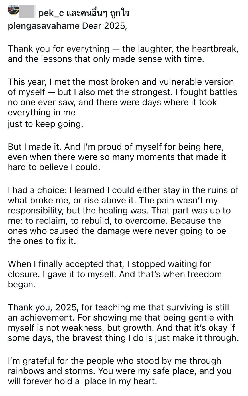 ขอบคุณนะ 2025 ที่สอนให้รู้ว่า “แค่มีชีวิตรอดมาได้” ก็ถือเป็นความสำเร็จที่ยิ่งใหญ่แล้ว ขอบคุณที่ทำให้เห็นว่าการใจดีกับตัวเองไม่ใช่ความอ่อนแอ แต่คือการเติบโต และขอบคุณที่บอกกันว่า ในบางวัน... สิ่งที่กล้าหาญที่สุดที่ฉันทำได้ คือการพาตัวเองผ่านพ้นวันนั้นมาให้ได้ก็พอ