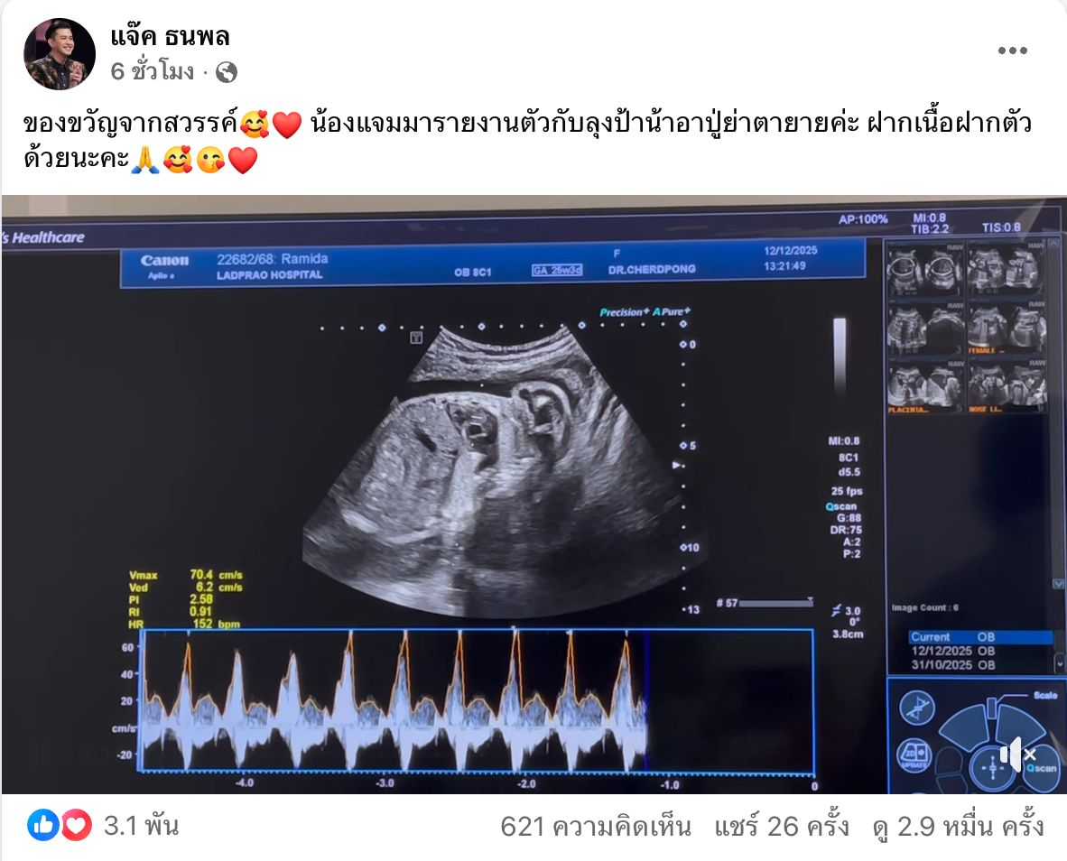 หลังจากที่ทำเซอร์ไพรส์แต่งงานไปแล้ว ล่าสุด แจ็ค ธนพล ก็ประกาศข่าวดีอีกครั้งต้อนรับปีใหม่กันเลยทีเดียว กับการเตรียมก้าวเป็นคุณพ่อ โดยเจ้าตัวลงคลิปอัลตราซาวด์ พร้อม แคปชันว่า "ของขวัญจากสวรรค์ น้องแจมมารายงานตัวกับลุงป้าน้าอาปู่ย่าตายายค่ะ ฝากเนื้อฝากตัวด้วยนะคะ"
