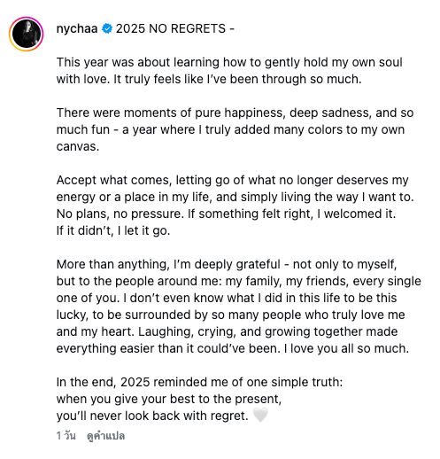 เรียกว่าปี 2025 เป็นอีกปีที่นักแสดงสาว ณิชา ณัฏฐณิชา ดังวัธนาวณิชย์ เจอเรื่องราวที่มากมายและหนักไม่เบา โดยเฉพาะในช่วงวันเกิดอายุครบ 29 ปีที่ผ่านมา ที่ต้องตกเป็นข่าวใหญ่ที่หลายคนให้ความสนใจ และเมื่อเริ่มปีใหม่ ณิชา ก็ได้รีแคปชีวิตในปี 2025 เอาไว้โดยมีข้อความดังต่อไปนี้