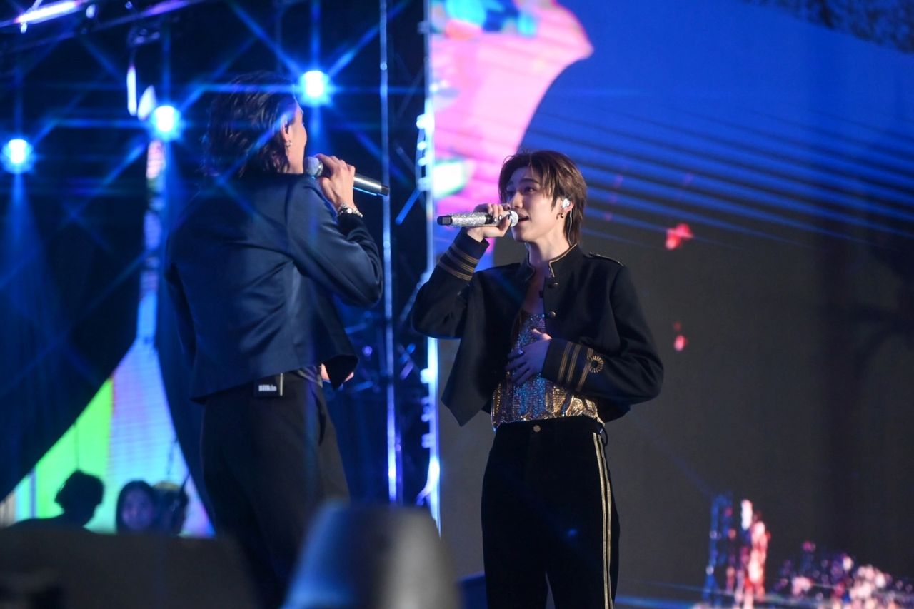 หนึ่งในโมเมนต์ที่ทั้งลานจับตา คือการปรากฏตัวของ บิวกิ้น–พุฒิพงศ์ และ พีพี–กฤษฏ์ ที่กลับมาร้องเพลงคู่กันอีกครั้งในรอบหลายเดือนกับเพลง “หัวใจผูกกัน” ถ่ายทอดความรู้สึกผ่านสายตาและเสียงเพลง จนเสียงกรี๊ดดังสนั่นราชประสงค์ กลายเป็นของขวัญปีใหม่ที่ผูกหัวใจแฟนคลับทั่วประเทศไว้ด้วยกันอย่างอบอุ่น