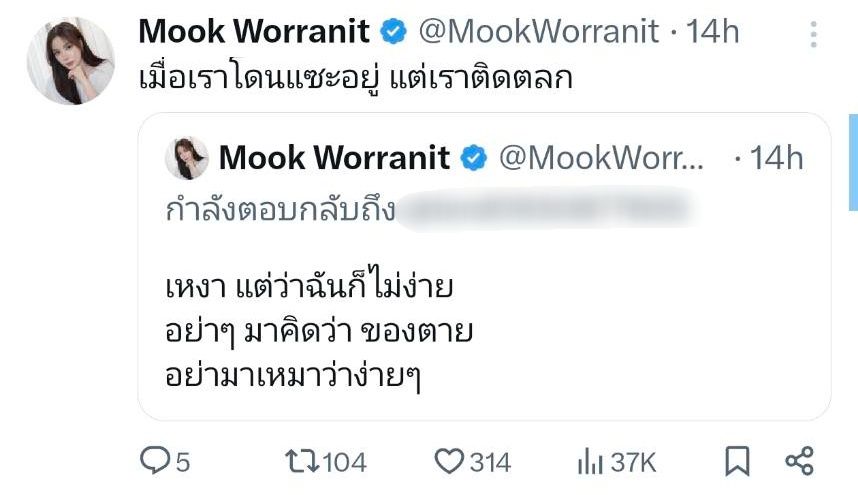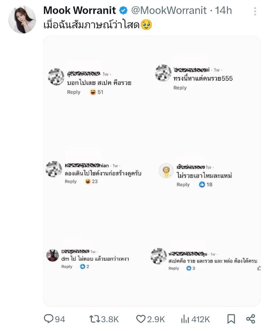 รวมถึงข้อความ “คนที่ชอบเบลมเรื่อง ผญ อยากหาคนรวย การไปเที่ยวพูดเรื่องแบบนี้ มันสะท้อนความไม่มั่นใจภายลึกของผู้พูด”