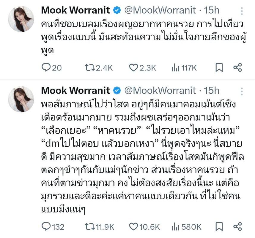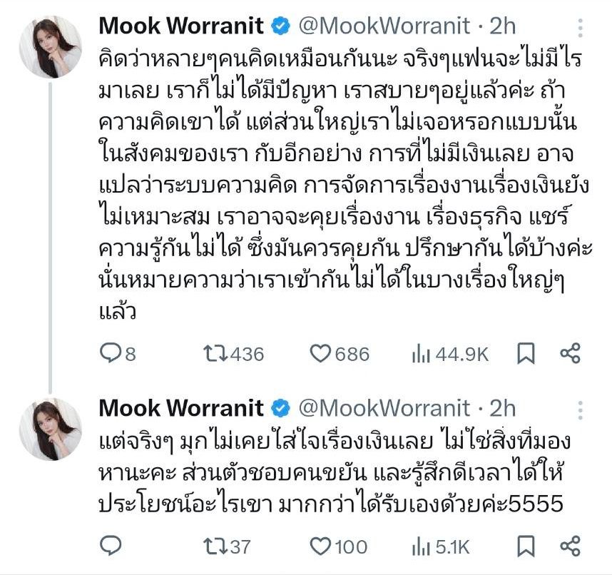 จากนั้น มุก วรนิษฐ์ โพสต์ข้อความเพิ่มเติมว่า “คิดว่าหลายๆ คนคิดเหมือนกันนะ จริงๆ แฟนจะไม่มีไรมาเลย เราก็ไม่ได้มีปัญหา เราสบายๆ อยู่แล้วค่ะ ถ้าความคิดเขาได้ แต่ส่วนใหญ่เราไม่เจอหรอกแบบนั้นในสังคมของเรา