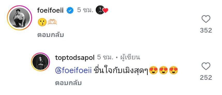 งานนี้นอกจากจะมีเพื่อนๆ แฟนๆ อวยพรปีใหม่และคอมเมนต์แซวแล้ว ด้านเฟย ภัทร ก็คอมเมนต์เป็นอีโมจิจุ๊บและทำมือรูปหัวใจ ก่อนที่ท็อปจะตอบกลับว่า “ชื่นใจกับเมิงสุดๆ”
