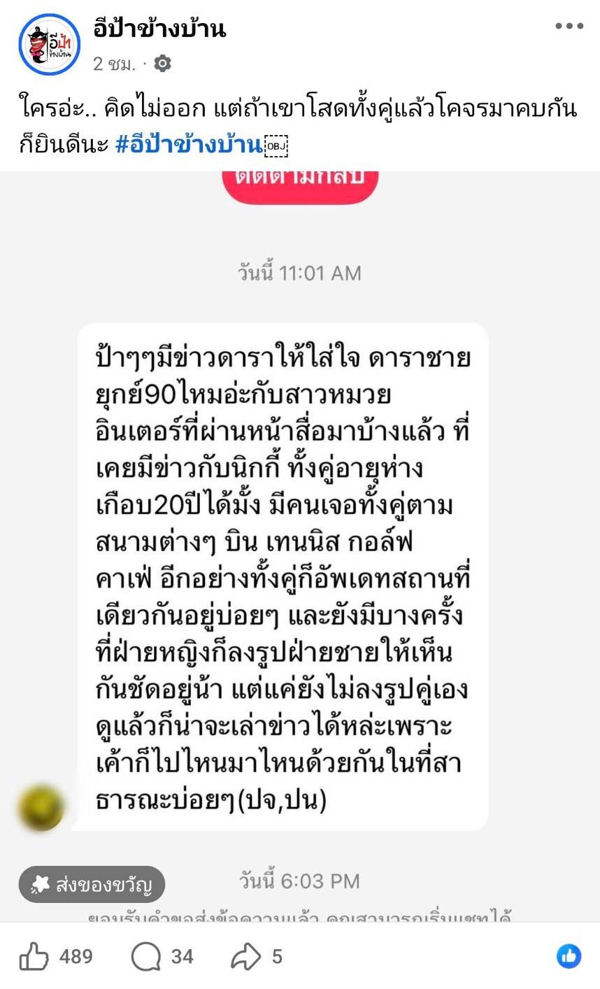 หลังจากที่เพจ อีป้าข้างบ้าน โพสต์ภาพข้อความของชาวเน็ตรายหนึ่งที่ส่งมาเมาท์ถึงเรื่องดาราชายยุค 90 ควงสาวหมวยอินเตอร์ที่เคยมีข่าวกับ นิกกี้ ทั้งคู่อายุห่างเกือบ 20 ปี มีคนเจอทั้งคู่ตามสถานที่ต่างๆ และทั้งคู่ก็อัปเดตสถานที่เดียวกันบ่อยครั้ง แต่ยังไม่ลงรูปคู่กัน ดูแล้วก็น่าจะเล่าข่าวได้ เพราะเขาไปไหนมาไหนด้วยกันในที่สาธารณะบ่อยๆ ก่อนจะปิดท้ายด้วยวงเล็บ (ปจ, ปน) ซึ่งหลายคนคาดเดาว่าน่าจะเป็นชื่อย่อของดาราที่ชาวเน็ตรายนี้กำลังหมายถึงอีกด้วย