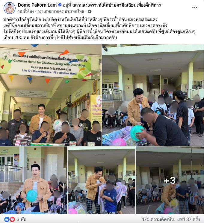 ซึ่งในเฟซบุ๊กแฟนเพจ Dome Pakorn Lam ได้โพสต์ภาพน่ารักประทับใจ โดมนำขนมและของเล่นไปฝากน้องๆ พร้อมทั้งเขียนข้อความว่า “ปกติช่วงใกล้ๆ วันเด็ก จะไปจัดงานวันเด็กให้ที่บ้านน้องๆ พิการซ้ำซ้อน แถวพระประแดง