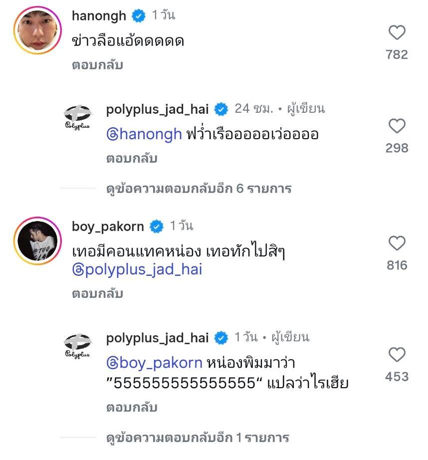 งานนี้พี่ชายของหน่องอย่าง บอย ปกรณ์ เลยเข้ามาตอบทันที “เทอมีคอนแทคหน่อง เทอทักไปสิๆ” แต่แอดมินโพลีพลัสตอบกลับว่า “หน่องพิมมาว่า ”555555555555555“ แปลว่าไรเฮีย”