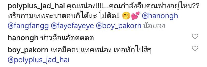 ล่าสุดค่ายโพลีพลัสโพสต์ภาพ หน่อง-ฟาง พร้อมทั้งเขียนข้อความแซวว่า “คุณหน่อง!!!!...คุณกำลังจีบคุณฟางอยู่ไหม?? หรือกามเทพจะมาตอบก็ได้นะ ไม่ติด!! @hanongh @fangfangg @fayefayeye @boy_pakorn”