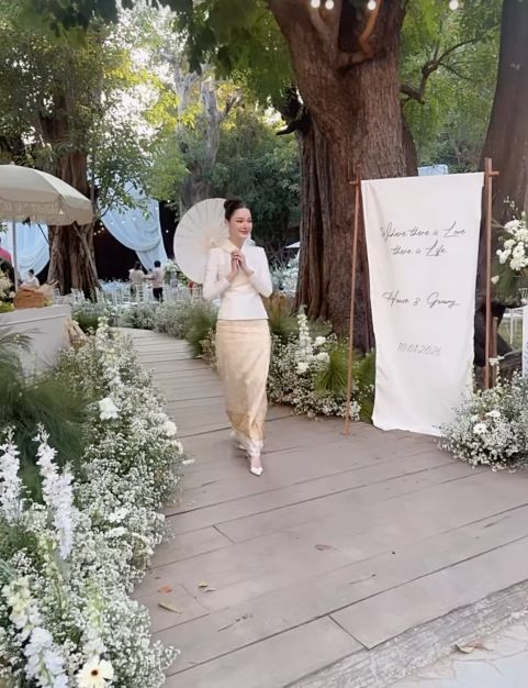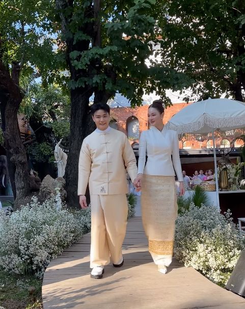 โดยเจ้าบ่าวและเจ้าสาวมาในชุดไทยล้านนาที่สั่งตัดพิเศษ มีดีเทลสุดประณีตคือ งานปักรูปกวางคู่บนผืนผ้า ซึ่งเป็นสัญลักษณ์แทนชื่อของเธอและสื่อถึงความรักที่มั่นคง