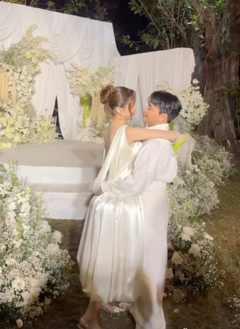ส่วนในช่วงเย็น งานเลี้ยงฉลอง กวาง ได้มาในชุดเจ้าสาวสีขาวบริสุทธิ์ ดีไซน์หวานละมุนแต่ยังคงความโฉบเฉี่ยวด้วยดีเทลเว้าหลังแอบเซ็กซี่เล็กน้อย ตามสไตล์แฟชั่นนิสต้าระดับตัวแม่