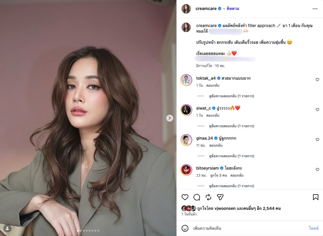 โดยในอินสตาแกรม @creamcare ได้โพสต์ภาพตัวเองหลังไปทำหน้า เห็นได้ชัดว่าหน้าสวยละมุนมากๆ เลยทีเดียว ซึ่งครีมก็เขียนแคปชั่นว่า "ผลลัพธ์หลังทำ filler approach มา 1 เดือน กับคุณหมอ... ปรับรูปหน้า ยกกระชับ เติมเต็มริ้วรอย เพิ่มความชื้น เริ่ดเลยยยยแหละ"
