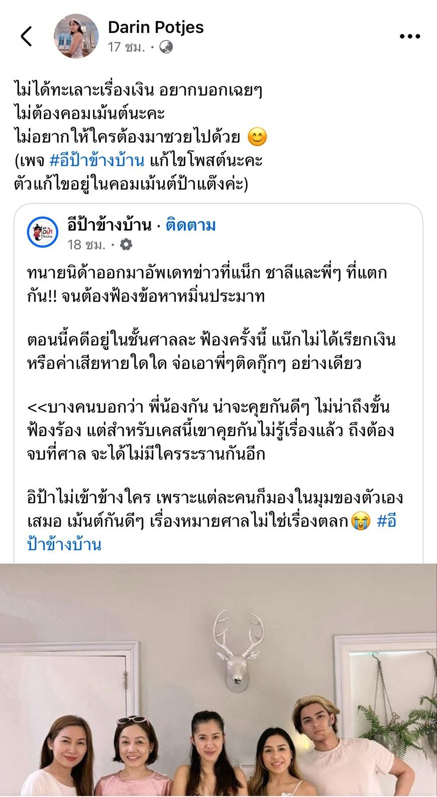 ทางด้าน ป้าแต๊ง พี่สาวคนโตของ แน็ก ชาลี ก็ได้แชร์โพสต์จากเพจ อีป้าข้างบ้าน ที่ได้เขียนเล่าข่าวของตัวเอง และได้เขียนแคปชั่นบอกชาวเน็ตไว้ว่า "ไม่ได้ทะเลาะเรื่องเงิน อยากบอกเฉยๆ ไม่ต้องคอมเม้นต์นะคะ ไม่อยากให้ใครต้องมาซวยไปด้วย"