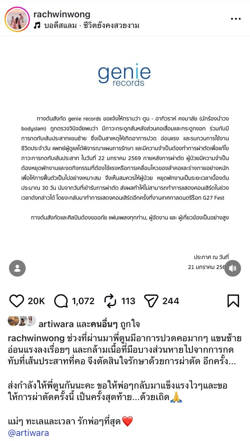 ทำเอาแฟนๆ ต่างเป็นห่วงไม่น้อย เมื่อทางค่ายจีนี่ เรคคอร์ด (genie records) ต้นสังกัดของ ตูน บอดี้สแลม ได้ออกมาแจ้งข่าวอาการป่วยของ พี่ตูน ที่ถูกวินิจฉัยว่ามีภาวะกระดูกสันหลังส่วนคอเสื่อมและกระดูกงอก ร่วมกับมีการกดทับเส้นประสาทแขนซ้าย จำเป็นต้องผ่าตัดแก้ไขภาวะการกดทับเส้นประสาทในวันนี้ (22 ม.ค. 2569) เบื้องต้นต้องพักงาน 30 วันหลังจากผ่าตัด