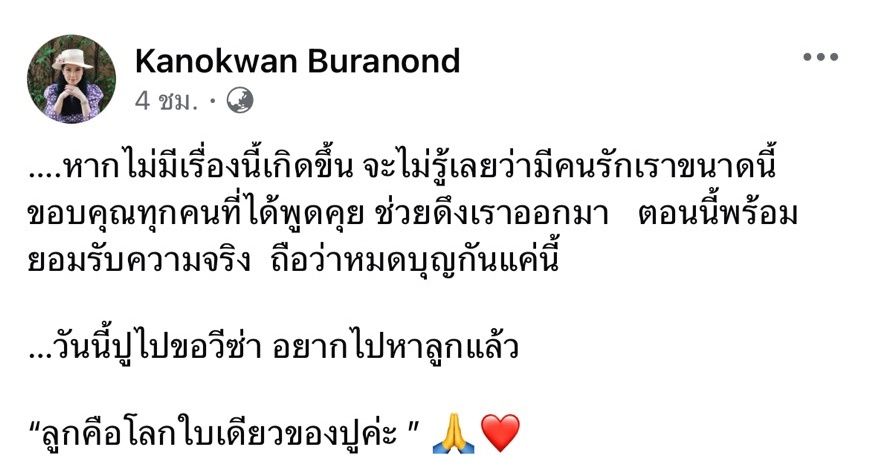 “….หากไม่มีเรื่องนี้เกิดขึ้น จะไม่รู้เลยว่ามีคนรักเราขนาดนี้ ขอบคุณทุกคนที่ได้พูดคุย ช่วยดึงเราออกมา ตอนนี้พร้อมยอมรับความจริง ถือว่าหมดบุญกันแค่นี้…วันนี้ปูไปขอวีซ่า อยากไปหาลูกแล้ว “ลูกคือโลกใบเดียวของปูค่ะ”