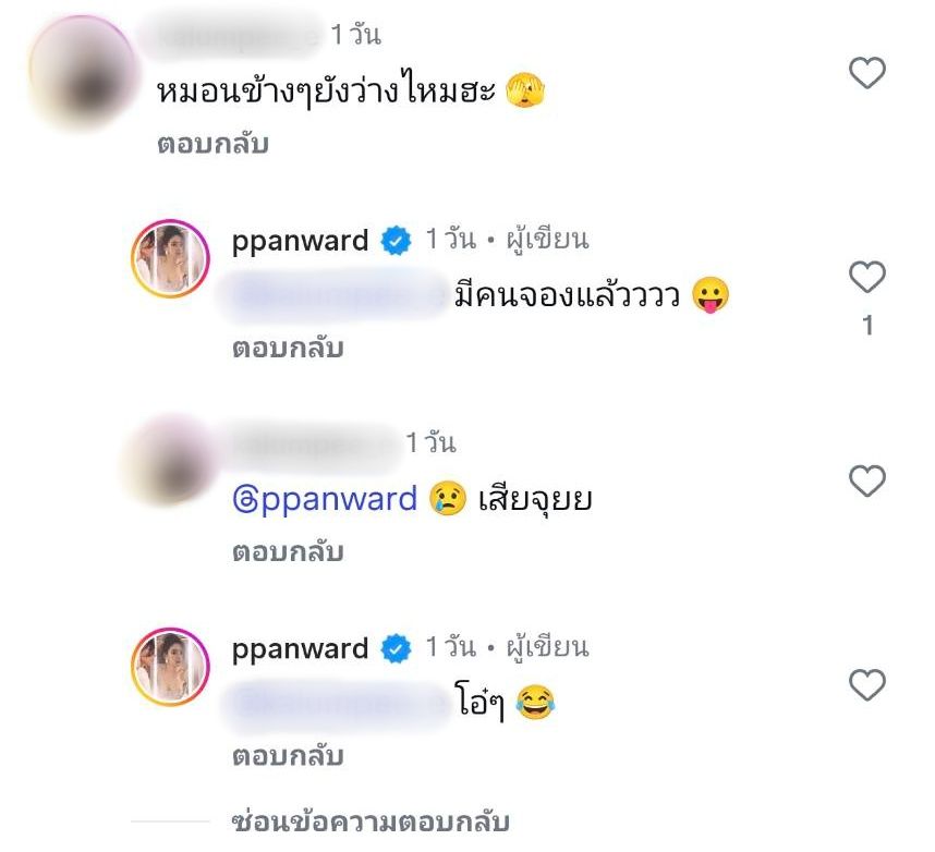 งานนี้ทำเอาแฟนๆ แห่กดไลก์และส่งอีโมจิหัวใจ พร้อมทั้งแซวความแซ่บรัวๆ แต่เมื่อมีผู้ใช้ไอจีรายหนึ่งถามว่า “หมอนข้างๆ ยังว่างไหมฮะ” เป้ยตอบกลับทันทีว่า “มีคนจองแล้วววว” พร้อมทั้งใส่อีโมจิแลบลิ้นด้วย อุ๊ย!! อะไรยังไงกันนะคะซิส!!