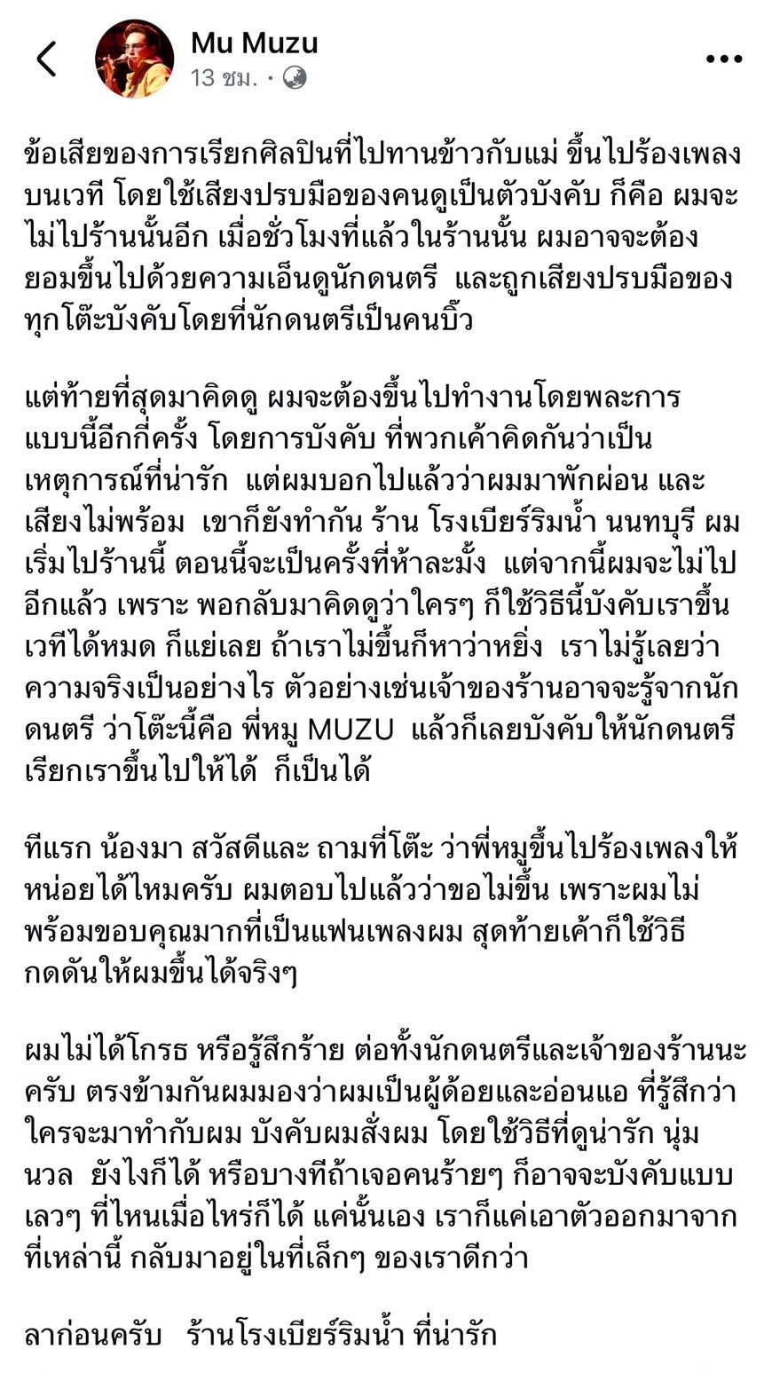 ไม่โอเคกับสิ่งที่เจอ ทำให้ต้องออกมาโพสต์ข้อความระบายความในใจ สำหรับ หมู MUZU เจ้าของเพลงดัง เข้ากันไม่ได้, ไม่เคย ที่ได้ออกมาโพสต์ข้อความเล่าเหตุการณ์ขณะพาคุณแม่ไปทานอาหารที่ร้านแห่งหนึ่ง แต่ถูกเจ้าของร้านให้นักดนตรีมาพูดกดดันเพื่อให้ขึ้นไปร้องเพลง ทั้งๆ ที่ปฏิเสธไปแล้ว โดย หมู MUZU ได้เขียนเล่าว่า