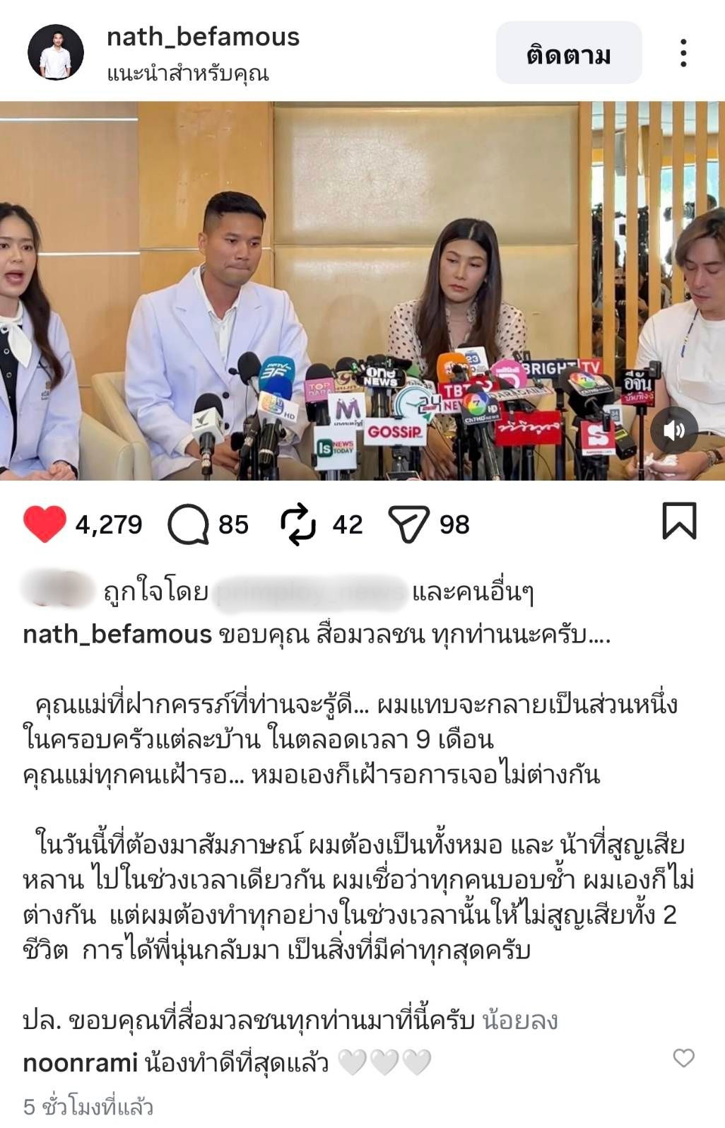 ล่าสุด นพ.ณัฏฐ์ เกียรติอภิวสุ แพทย์เฉพาะทางด้านเวชศาสตร์มารดาและทารกในครรภ์ จาก PWS CLINIC BANGKOK ซึ่งเป็นสูตินรีแพทย์ที่ดูแลครรภ์ของนุ่นมาตั้งแต่แรก ก็ได้โพสต์ภาพขณะแถลงข่าวร่วมกับ นุ่น-หลุยส์ ท่ามกลางบรรยากาศสุดเศร้า พร้อมทั้งเขียนข้อความที่อ่านแล้วจุกอกในใจ