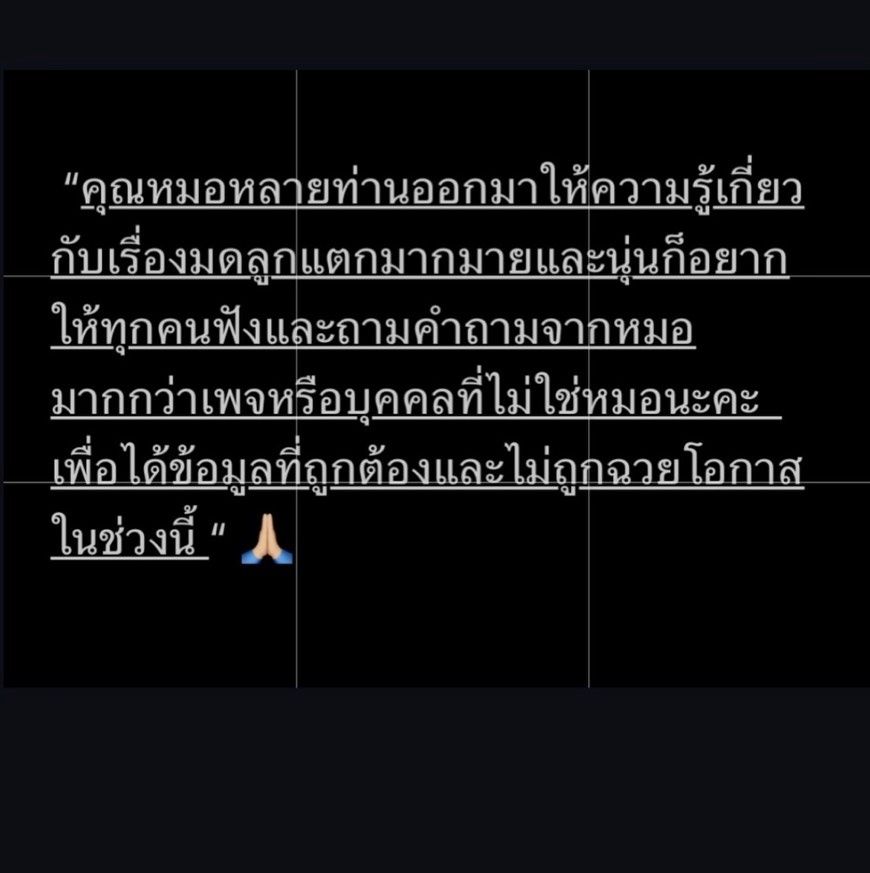 “คุณหมอหลายท่านออกมาให้ความรู้เกี่ยวกับเรื่องมดลูกแตกมากมายและนุ่นก็อยากให้ทุกคนฟังและถามคำถามจากหมอ มากกว่าเพจหรือบุคคลที่ไม่ใช่หมอนะคะ เพื่อได้ข้อมูลที่ถูกต้องและไม่ถูกฉวยโอกาสในช่วงนี้”