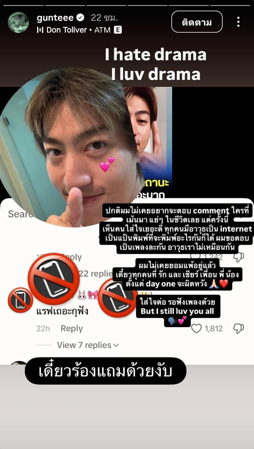 และล่าสุด ซีดี กันต์ธีร์ โพสต์ไอจีสตอรี่อีกครั้งถึงเรื่องดังกล่าว เพราะถึงแม้เจ้าตัวจะออกมาชี้แจงแล้วก็ยังเจอทัวร์ลงต่อเนื่อง โดยบอกว่า “I hate drama. I luv drama.