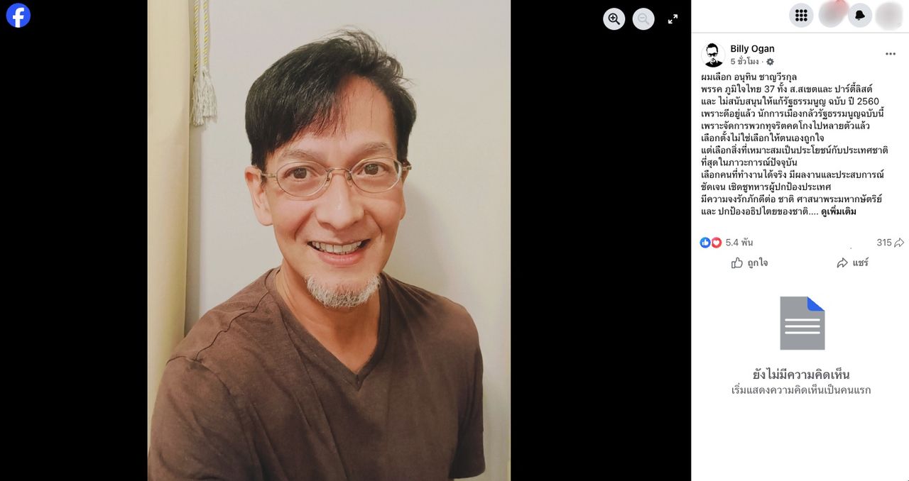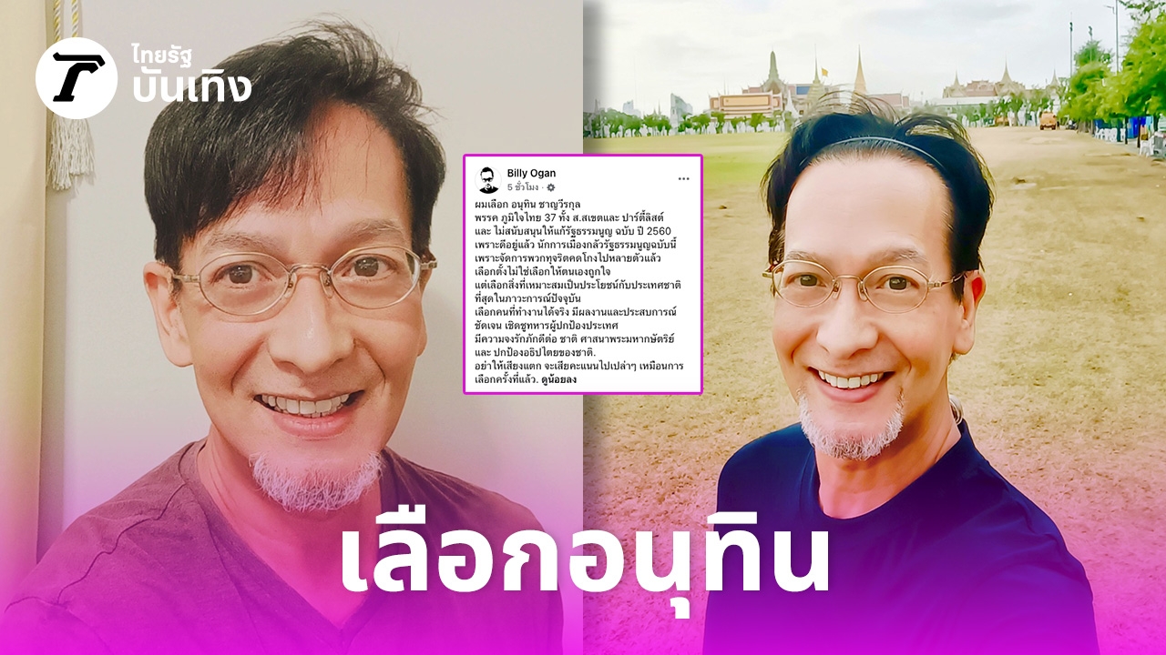 ทำเอาโลกโซเชียลฮือฮาทันที เมื่อนักร้องนักแสดงหนุ่มรุ่นใหญ่ บิลลี่ โอแกน โพสต์ประกาศชัดเจนว่าเลือก นายอนุทิน ชาญวีรกูล เป็นนายกรัฐมนตรี อีกทั้งเลือกพรรคภูมิใจไทยทั้ง ส.ส.เขต และ ส.ส.ปาร์ตี้ลิสต์