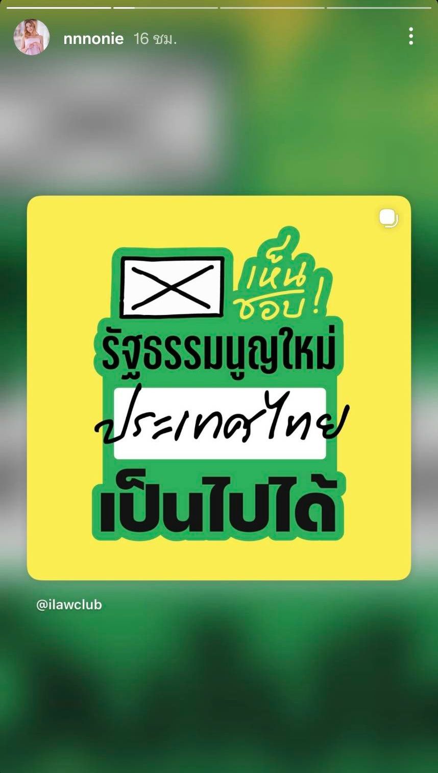 โดยโพสต์แรก นนนี่ แชร์ภาพข้อความเกี่ยวกับการเลือกตั้งและประชามติที่บอกว่า "เห็นชอบ รัฐธรรมนูญใหม่ ประเทศไทย เป็นไปได้" แต่หลังจากนั้น นนนี่ โพสต์ภาพจอดำ และเขียนข้อความเล็กๆ ตรงหัวมุมว่า “อายคนจัง” และใส่อีโมจิน้ำตาไหล ก่อนจะโพสต์ภาพและเขียนข้อความว่า “หนีกลับหลุม”