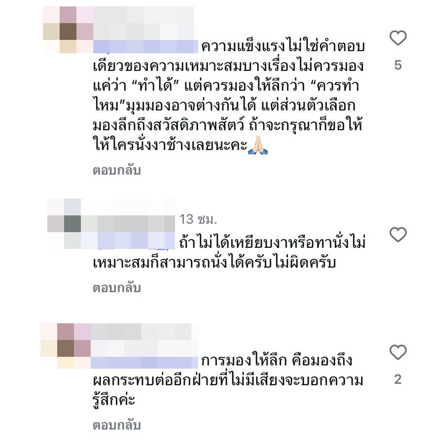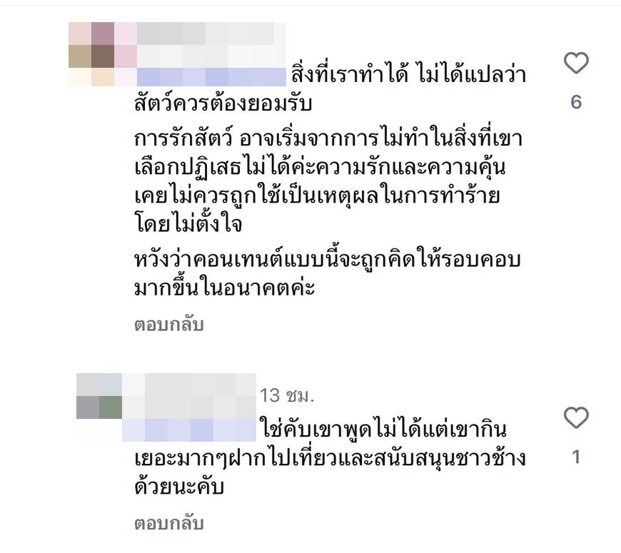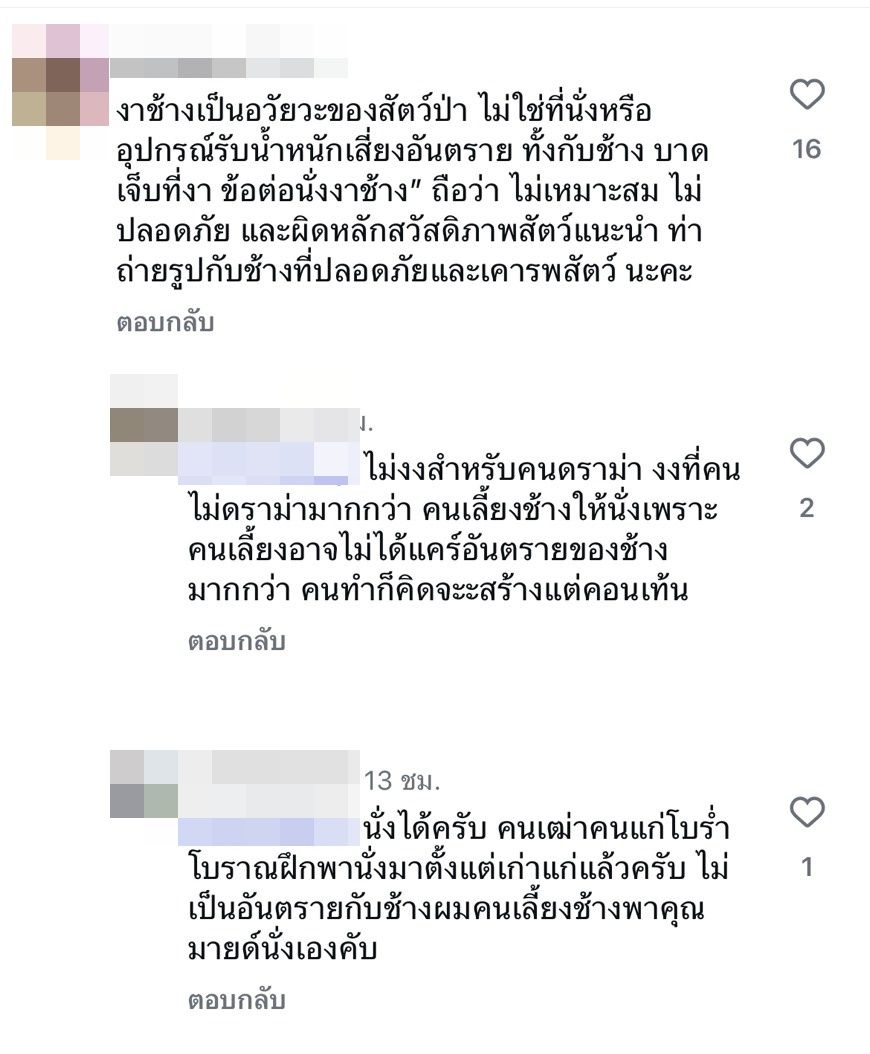 หวังว่าคนจะไม่ไปขึ้นงาช้างตามนะ น้องคงหนักแน่ๆ ถึงจะบอกแค่แป๊บเดียวก็เถอะ, งาช้างเป็นอวัยวะของสัตว์ป่า ไม่ใช่ที่นั่งหรืออุปกรณ์รับน้ำหนักเสี่ยงอันตราย ทั้งกับช้าง บาดเจ็บที่งา ข้อต่อนั่งงาช้าง ถือว่า ไม่เหมาะสม ไม่ปลอดภัย และผิดหลักสวัสดิภาพสัตว์แนะนำ ท่าถ่ายรูปกับช้างที่ปลอดภัยและเคารพสัตว์ นะคะ, ไม่งงสำหรับคนดราม่า งงที่คนไม่ดราม่ามากกว่า คนเลี้ยงช้างให้นั่งเพราะคนเลี้ยงอาจไม่ได้แคร์อันตรายของช้างมากกว่า คนทำก็คิดจะสร้างแต่คอนเทนต์