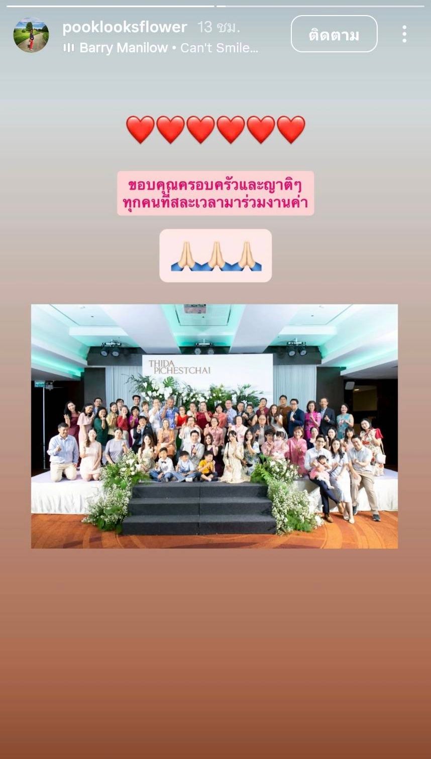 อีกทั้งยังโพสต์ภาพคู่กันในไอจีสตอรี่ รวมถึงภาพบรรยากาศในงานวิวาห์ซึ่งถูกจัดขึ้นแบบเรียบง่าย มีเพียงคนในครอบครัวรวมถึงญาติๆ ของทั้งสองฝ่ายมาร่วมงานในวันสำคัญของทั้งคู่ พร้อมทั้งเขียนข้อความว่า “ขอบคุณครอบครัวและญาติๆ ทุกคนที่สละเวลามาร่วมงานค่า” และใส่อีโมจิยกมือไหว้