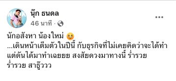 ล่าสุดวันนี้ก็มีเรื่องราวดี ๆ เกิดขึ้นเมื่อทาง “หนุ่มนุ๊ก ธนดล” ได้โพสต์ภาพตัวเอง ยืนอยู่ที่หน้าสำนักงานบังคับคดีจังหวัดขอนแก่นพร้อมกับข้อความว่า “นักอสังหา น้องใหม่…เดินหน้าเต็มตัวในปีนี้ กับธุรกิจที่ไม่เคยคิดว่าจะได้ทำแต่ดันได้มาทำเฉย ๆ สงสัยดวงมาทางนี้ ร่ำรวย ร่ำรวย สาธุ”